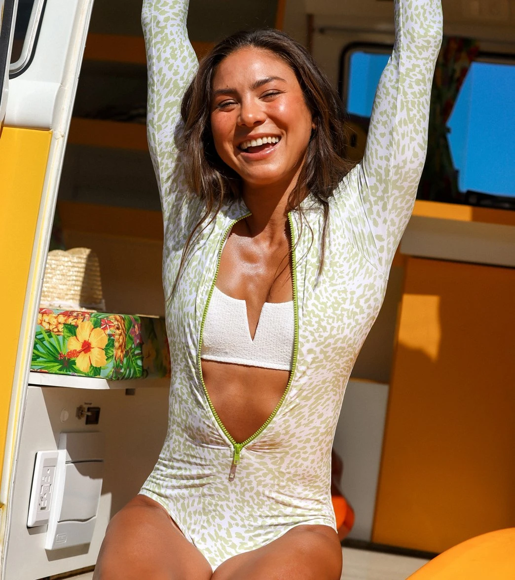 Sporti x Stef Corgel Manhattan Beach Cheetah Zip Front Long-Sleeve One Piece Swimsuit is Stef’s favorite suit.