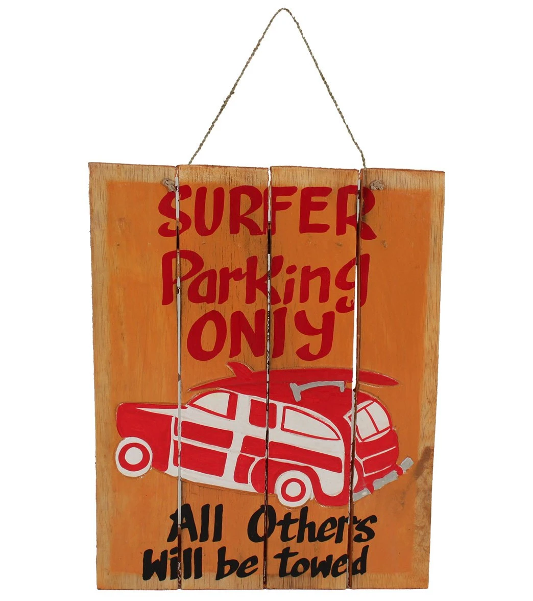 Make your home feel like you’re still on vacation with the Wet Products Surfer Parking Wood Slat Sign 12″x16″.