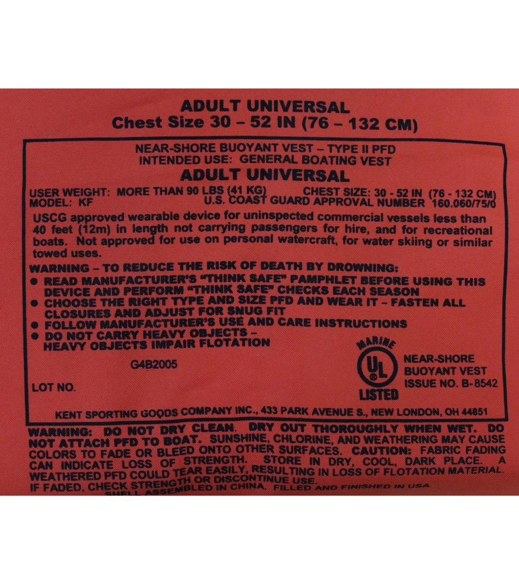 Stay ready in the water with the KEMP USA Type II Adult Life Jacket. This is a basic floatation device that is designed to provide minimum buoyancy and turn an unconscious person face up in calm water situations.