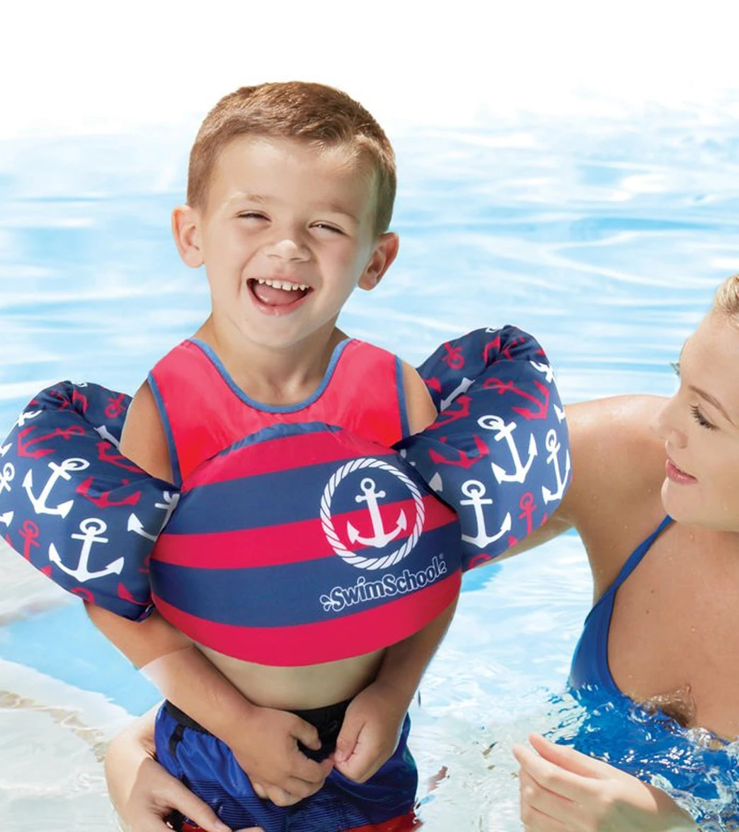 - SwimSchool USCG Approved TOT Swimmer, Puddle Jumper with Arm Floaties, Type V Life Jacket, Medium/Large, Navy Nautical