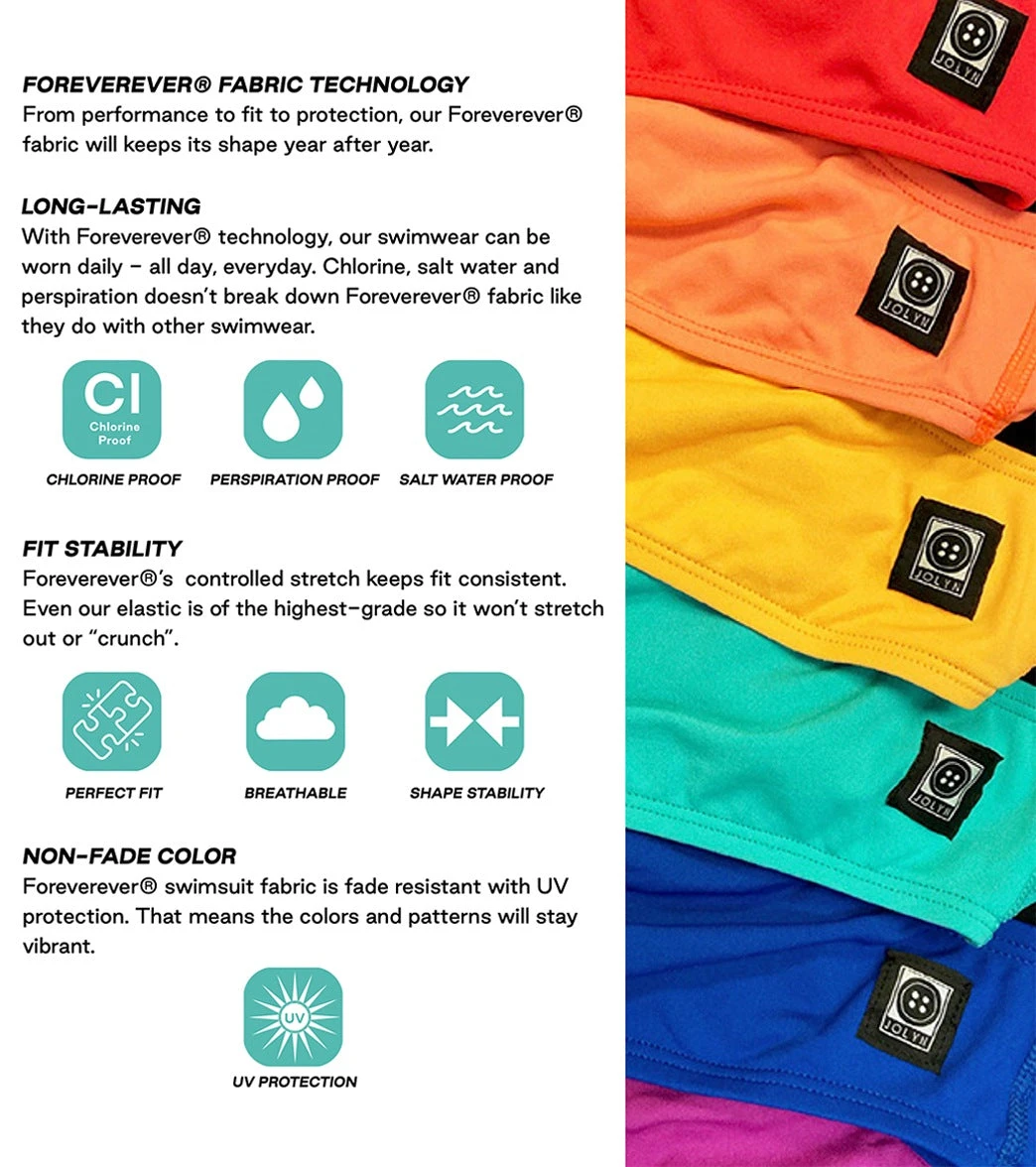 - Longlasting Foreverever® fabric technology is made to withstand chlorine, saltwater, and perspiration, meaning you can wear it every day!